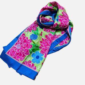 Lilly Pulitzer & Ford 2005 Breast Cancer Awareness Collaboration - a 100% silk scarf in a long rectangle shape with a gorgeous all over floral design - the colors really pop on this fine accessory. Deep blue border - stunning pink blue and green colors - so many ways to use this lovely designer scarf! In excellent pre-owned condition - light wear but no damage or flaws - so pretty!