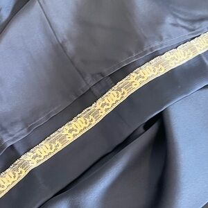 From personal collection, never got to wear! Navy blue satin dress with front bow detail. Hidden corset with boning on the inside. Hidden back zipper. Small slit on both sides, sweetheart neckline, 51” in length. Strapless.