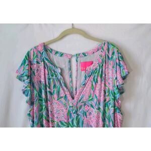 The Lilly Pulitzer French Blue Turtely Ravi Short Sleeve Romper in size Large is a stylish and vibrant one-piece outfit perfect for casual occasions. Featuring a floral pattern in a beautiful blue color, this romper is made from a blended fabric that offers comfort and style. With its short sleeves and shorts included, this romper is a versatile piece for any woman's wardrobe. Created by the renowned Lilly Pulitzer brand, this romper is a must-have for those looking for a fashionable and on-trend outfit.