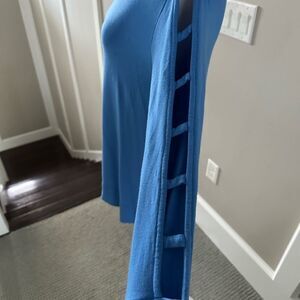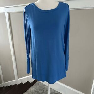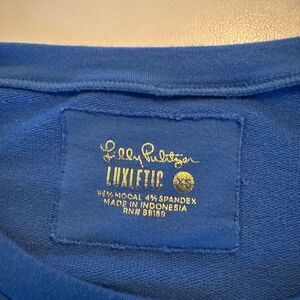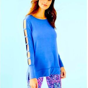 Step out in style in this coastal blue, Lilly Pulitzer Luxletic pullover with ladder cut out detail on sleeves. Modal & spandex blend. L 25” x W 17” pit to pit.
