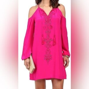 Gorgeous bright pink cold shoulder dress by Lilly Pulitzer. Long sleeves with elastic cuffs and shoulder cut outs. Embroidery down the front with beads. Optional tie with tassels at the chest. V-neck notch neckline. Pullover style. Great condition! Women’s size small. 100% silk! Lined.