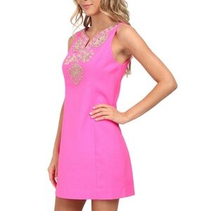 Lilly Pulitzer Gabby Shift Dress Pink Cotton Floral Split Neck Back Zip Womens 2