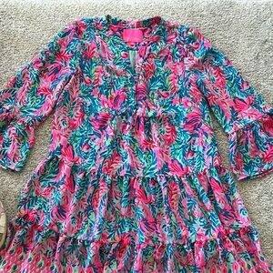 Lilly Pulitzer Gabriel Dress Surf Blue Flim Flam Engineered Print. Gorgeous for any occasion! Easy fit, tiered tunic dress with front bib & half placket, 3/4 length ruffle hem sleeves. Roomier fit. Lined. Laying flat approx 34” shoulder to hem, 17” pit to pit. 100% polyester. Size 00. Like new condition.