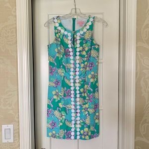 EUC Lilly Pulitzer Ginny Dress in Moving Slowly. Misses size 0. Has center front neckline slit opening with button (sort of a keyhole but not rounded). Center front trim detail (elongating to the figure). Lined. Excellent condition with no flaws (worn just a couple times, line dried).