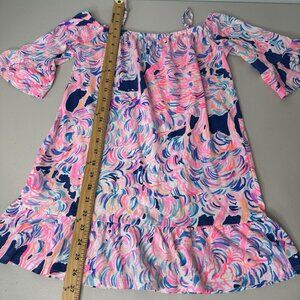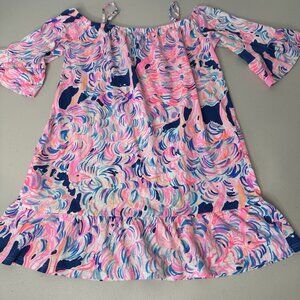 Lilly Pulitzer Girls Jaci Off The Shoulder Dress Sz L (8-10) Pink Blue Flamingo
