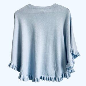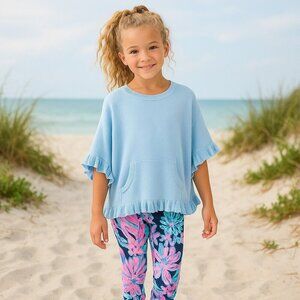 Adorable Lilly Pulitzer girls poncho-style top in a breezy light blue knit with playful ruffle trim along the hem and sleeves. Features a relaxed fit with a single front kangaroo pocket and a soft, comfy 100% cotton feel—perfect for layering over leggings, swimwear, or casual outfits. Ideal for beach days, vacations, or cozy lounging with that signature Lilly Pulitzer charm.