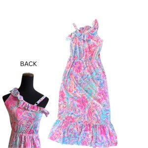 Bright and beautiful Lilly Pulitzer girls’ maxi dress featuring a colorful tropical print with pink, aqua, and coral tones. Fun one-shoulder design with ruffle detail and elastic waist for a comfortable, flattering fit. Perfect for spring, summer, or vacation wear!