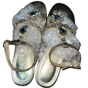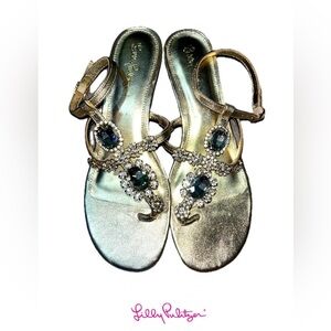 Lilly Pulitzer Glamorous Gold and Silver Jeweled Sandals with Ankle Straps, 7.5M
