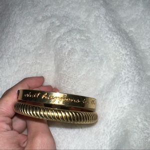 Gold rope/woven bangle, gold scripted bangle with elephants that says “what happens in the jungle stays in the jungle”