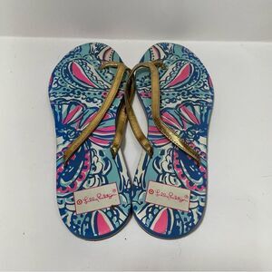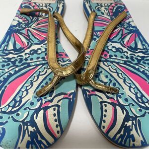 Gently worn women’s size 9-inner size tag worn off Lilly Pulitzer patterned and metallic gold flip flop sandals. Please review all photos for any signs of wear-pictured as is. Disclaimer: Any items with any wear/staining has not been treated, and unsure of ability to remove/treat condition. Comes from a smoke free home, bundle with other items to save & minimize shipping cost.