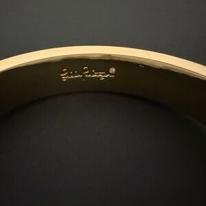 This exquisite bracelet from Lilly Pulitzer features a luxurious gold-toned frame adorned with vibrant pink enamel, showcasing delicate floral motifs. The intricate design highlights stylized lilies in soft pastel shades, adding a touch of elegance to any ensemble. Perfect for elevating your style with a pop of color and sophistication.