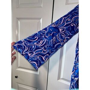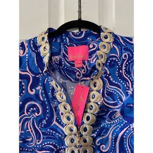 This Lilly Pulitzer tunic dress in size 4 features a vibrant blue and pink pattern with gold embellishments. Made from a comfortable stretch fabric blend of rayon and spandex, it has a V-neckline and long sleeves, making it ideal for spring. The short dress length and stylish design make it perfect for party or cocktail occasions. Manufactured in Sri Lanka, it is machine washable for easy care. The dress is new with tags and features the Gracelynn print.