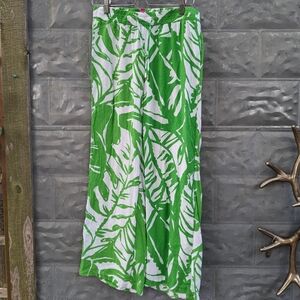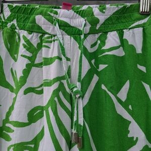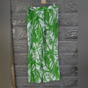 Vibrant green leaf print on white pants. Relaxed fit. Perfect for casual outings.