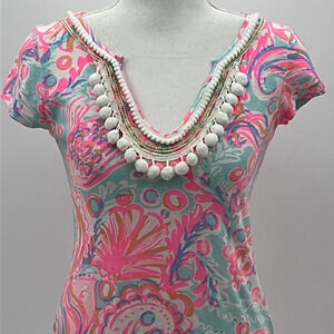 Lilly Pulitzer Harper Cotton/Linen Dress in Pink Pout - Size XXS. Great pre-owned condition. Very light amount of pilling, mainly due to the fabric content. Cotton and linen fabric blend. Cap sleeves, split neck, pom pom decoration around neckline. Approximate measurements: 16" pit to pit, 31" length. Style 20932. Actual color description is Pink Pout Too Much Bubbly.