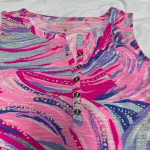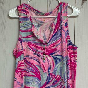 Features: Sleeveless, henley button placket, easy A-line fit, vibrant allover print