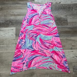Sleeveless swing dress in a vibrant pink, aqua, and purple swirl print by Lilly Pulitzer. Soft handkerchief hem and decorative neckline buttons. Lightweight and perfect for summer vacations, beach weddings, or poolside cocktails.