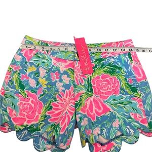 Vibrant floral shorts by Lilly Pulitzer. Features a high waist and scalloped hem. Perfect for summer style.
