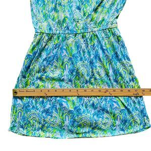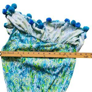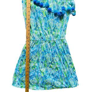 Lilly Pulitzer Idara One-Shoulder Romper XXS Green Blue Pom-Pom Resort Cruise. 100% cotton. Condition: never worn, from deadstock, no tag.There's minor flaw: defacing of brand tag, it looks like it is ripped. Composition tag was cut off.