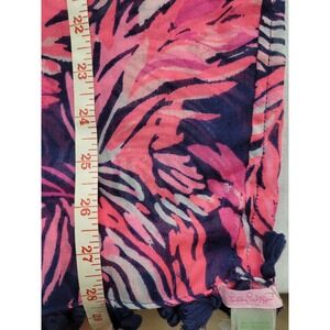 Embrace effortless chic with this vibrant Lilly Pulitzer infinity scarf. Its lively pink and navy blue leaf print creates a bold statement, perfect for adding a pop of color to any outfit. Delicate navy blue tassels adorn the edges, lending a playful, bohemian touch to the design. The lightweight fabric drapes beautifully, making it an ideal accessory for year-round wear. Versatile and stylish, this infinity scarf can be worn in a multitude of ways, allowing for endless styling possibilities. Wear it as a vibrant accent to a casual jeans-and-tee look, or as a finishing touch to an elegant evening ensemble. It's also the perfect accessory for vacations or outdoor festivals.