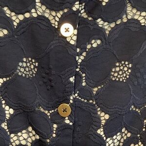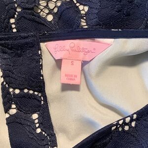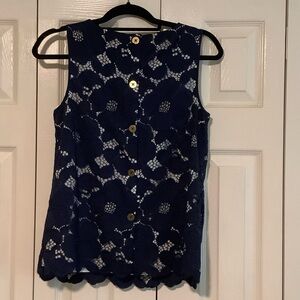 Lilly Pulitzer “Iona” sleeveless lace overlay top. Elegant navy lace sleeveless top perfect for any occasion. Features a delicate floral pattern for a sophisticated look. Gold buttons up back. Armpit to armpit 18 inches across. 24.5 inches long. Size Small. EUC. Smoke free/pet free home.