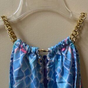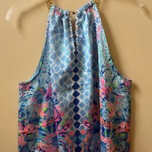 Lilly Pulitzer Isa Halter Top. Pattern: Hidden Treasure Engine. Gold metal chain halter strap with clasp closure. The measurement from bottom of left armhole to bottom of right armhole is approx 22", length is approx. 24" from shoulder to hem.100% polyester.