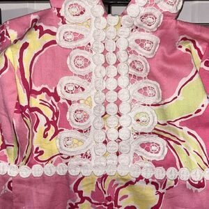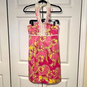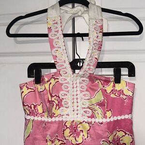 Cute Lilly Pulitzer Isabel halter shift dress. Lined with zipper back. Lace detail throughout.