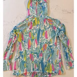 Lilly Pulitzer Luxletic athletic jacket. Features a zipper, drawstring with tassels, and hood.