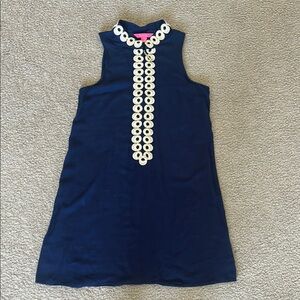 Stylish navy dress with cream detailing. Sleeveless design. Worn once.