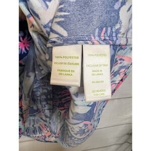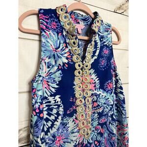 This VGUC Lilly Pulitzer Jane Shift Dress in Deep Indigo Gypsea Girl features a sleeveless design with a collared neckline and a zip closure. The dress is adorned with embroidered accents in blue, pink, and gold colors, adding a touch of elegance. Perfect for various occasions such as travel, weddings, parties, or casual wear, this short dress in size 4 is ideal for the summer and spring seasons with its beach and tropical theme. Made of polyester, it is machine washable for easy care and maintenance!