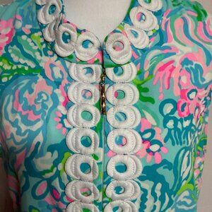 Vibrant Lilly Pulitzer Jane Shift in the coveted BLUE IBIZA AQUA LA VISTA print. Classic sleeveless shift silhouette with the signature white decorative trim along the collar and front placket—perfect for resort, parties, and sunny days.