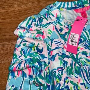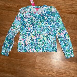 Elevate your style with this elegant Lilly Pulitzer blouse, featuring a ruffled design and long sleeves. The vibrant blue and green hues create a fresh, lively look perfect for any occasion. Crafted from lightweight fabric, this top offers both comfort and sophistication.