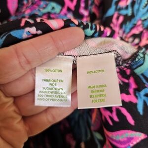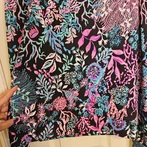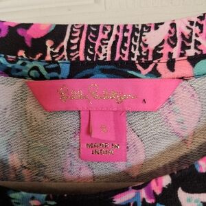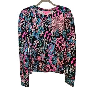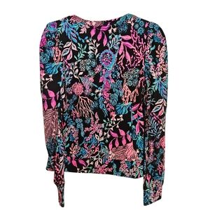 This eye-catching blouse by Lilly Pulitzer features a vibrant mix of pink and blue hues, adorned with graphic and asymmetrical designs. The blouse showcases a round neckline and full-length sleeves, making it a stylish choice for any occasion. Its unique pattern and lively colors ensure you stand out in any crowd.