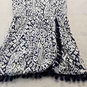 The Lilly Pulitzer Jarrett Sleeveless romper Size Medium faux wrap with tassels White and Blue is a stylish one-piece garment featuring a floral pattern with tasseled accents. Made of 96% Rayon and 4% Spandex fabric, this romper has a sleeveless design with a tassel tie, elastic waist, and pockets, offering both comfort and functionality. Perfect for travel, activewear, or casual wear, this romper in size Medium is ideal for beach, nautical, or coastal-themed occasions in the summer, fall, or spring seasons.