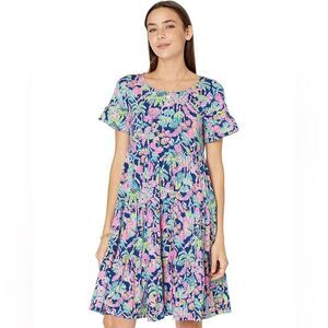 Twirling is encouraged when you flaunt the fabulously feminine Jodee Dress. Designed in a chic swing silhouette, this tiered dress also has a flounced hem with short sleeves. Brightened up with a multicolored Lilly print, this style is ideal for a weekend getaway or even backyard celebrations--maybe with a little dancing, too.