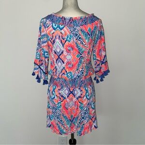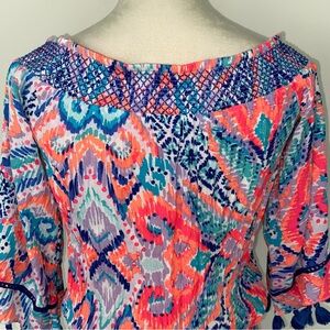 Lilly Pulitzer Joelle Dress Off Shoulder Crepe Multi Smocked Tassel M Beach