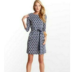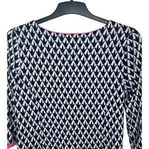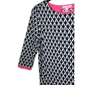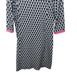 This Lilly Pulitzer dress is a delightful combination of comfort and style. Its chevron pattern in navy and white is both bold and timeless. The pink accents add a playful touch, while the 3/4 sleeves and soft knit fabric ensure a cozy fit. Perfectly versatile for both casual outings and semi-formal events.