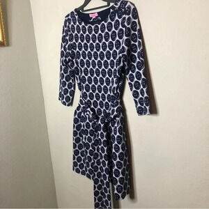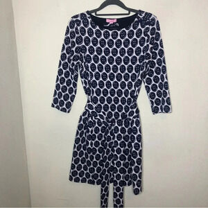 Lilly Pulitzer Jonah Dress in Button Print Size xs. In very good used condition. Pale gray background with navy button print on the fabric. 3/4 sleeves. Knee length. Adjustable contrast fabric tie at the waist. Button detailing on right shoulder. Poly/cotton/spandex blend.