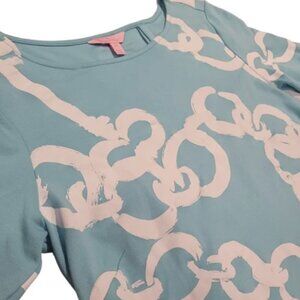 Lilly Pulitzer, JONAH PONTE, Blue Ball Chain, Stretch Knit, Medium, Spring, Summer, Coastal, Nautical, Short Sleeve, Tailored, Boat Neck, Keys and Chains Design, Excellent Condition, Pre-owned, Casual, Party, Cocktail, Travel, Aloha Theme.