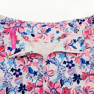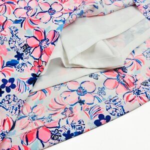 Wear the Lilly Pulitzer Jonas Skort and enhance your style quotient. Straight-fit skort. High-waist design. Two pork chop pockets on the front. Hook-and-eye and zippered closure. Colorful lily flower print. 97% polyester, 3% spandex. Machine wash, and tumble dry.
