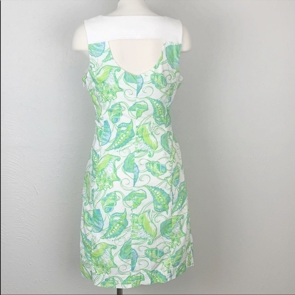 Lilly Pulitzer Jubilee White & Green Shell patterned shift Dress with white embroidery. Cut out detail in the front chest and the back.