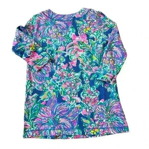 This Lilly Pulitzer Justina tunic is a colorful addition to your wardrobe. The 3/4 sleeve blouse features a V-neckline and a pullover closure, making it perfect for casual and travel occasions. The top is made of a comfortable jersey fabric blend of spandex, viscose, and cotton, ensuring UV protection and a regular fit. The multicolor design is perfect for the beachy, coastal, and preppy themes of summer, fall, and spring. The blouse is available in women's size XS and is not personalized or handmade.