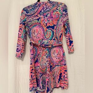 Chic romper with a lively paisley design. Features pink, blue, and orange tones. Has shorts foot romper but looks like a dress. Comfortable and colorful.