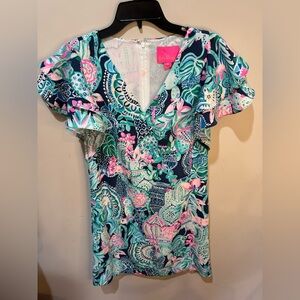 Lilly Pulitzer Kathie Dress Lookin Sharp Sz 0 Flutter sleeve Sheath dress Zipper closure Approx measurements Underarm 16.5” Length 35”