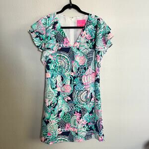 Lilly Pulitzer Kathie Flutter Sleeve Mini Dress Blue V-Neck Floral Back Zip Sz 2