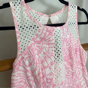 Pink & White seashell patterned in Lilly’s classic textured cotton blend. Features a triangular keyhole at back, hidden back zipper, white eyelet panels over bust and shoulders. Fully lined.