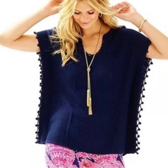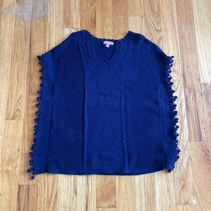 Size small. Pull over sweater with poncho style sleeves. Pom pom details down sides. 100% cotton material. Great used condition, no flaws.