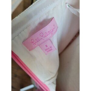This is a rare and highly sought-after Lilly Pulitzer Keetan First Impressions strapless dress in size 8. The dress features a beautiful floral pattern with pink color, perfect for any occasion such as weddings, parties, or casual events. The dress is made of cotton material with accents of a zipper and is an A-line style with a short dress length.