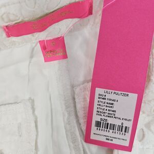 Brand new with tags, these Lilly Pulitzer shorts feature an oval flower petal eyelet pattern for a chic, feminine look. Resort-ready, this piece has a textured finish and classic white color, perfect for casual outings, beachwear, or summer parties. Labeled size 0; measurements in photos. Made in Sri Lanka. Retailed for $88.