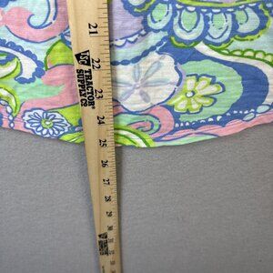 The Lilly Pulitzer Kirby Top is a colorful beach-themed blouse made of 100% cotton, perfect for summer and spring occasions. This size small top features a V-neckline, 3/4 sleeves, and a quarter-button closure, adding a touch of elegance to its casual style. Whether for travel, parties, or everyday wear, this Lilly Pulitzer top is a stylish and comfortable choice for women looking for a fun and vibrant addition to their wardrobe. Made in Peru, this blouse showcases the brand's commitment to quality and unique design.