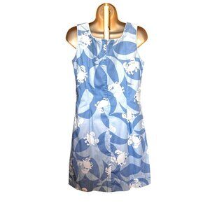 A sleeveless shift dress featuring a rare and collectible Soft Blue Charlie's Crab print in soft blue and white tones. Ideal for warm-weather outings or coastal-inspired gatherings with its lightweight cotton shell and tailored design. Lilly Pulitzer tag is white label.